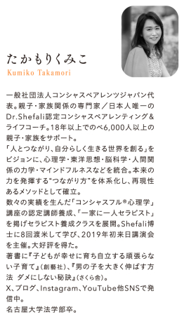 一般社団法人コンシャスペアレンツジャパン代表。親子・家族関係の専門家/日本人唯一のDr.Shefali認定コンシャスペアレンティング&ライフコーチ。18年以上のべ6000人以上の親子・家族をサポート。「人とつながり、自分らしく生きる世界を創る」をビジョンに、心理学・東洋思想・脳科学・力学・マインドフルネスなどを統合。本来の力を発揮する“つながり方”を体系化し、再現性あるメソッドとして確立。数々実績を生んだ「コンシャスフル心理学」講座の認定講師養成、「一家に一人セラピスト」を掲げセラピスト養成クラスを展開。シェファリ博士に8回渡米して学び、2019年初来日講演会を主催。大好評を得た。著書に『子どもが幸せに育ち自立する頑張らない子育て』(創藝社)、『男の子を大きく伸ばす方法 ダメにしない秘訣』(さくら舎)。X、ブログ、インスタ、YouTube他SNSで発信中。名古屋大学法学部卒。